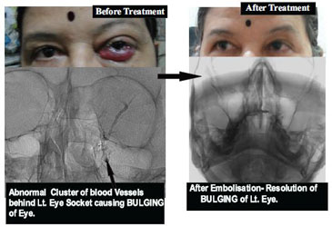 Example- 50 Yrs. lady presented BULGING of Lt. Eye with due to Cavernous Dural AVM. After Embolisation , resolution of eye swelling happened within hours