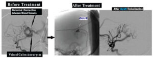 With Interventional Neuroradiological ,Without opening the Skull ; these Connections between Arteries Abnormal and Veins in Brain can be treated by technique of Glue Embolisation .