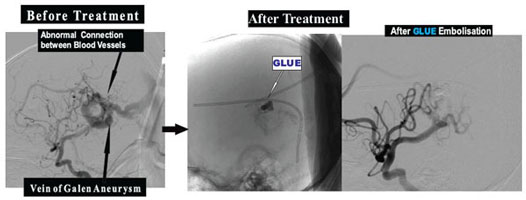 Example: 4 month old baby boy presented with Stunted Growth and large head due to Vein Of Galen Aneurysmal malformation (VOGAM). After GLUE Embolisation of Vein Of Galen Aneurysmal malformation (VOGAM), now he is growing at normal stages.